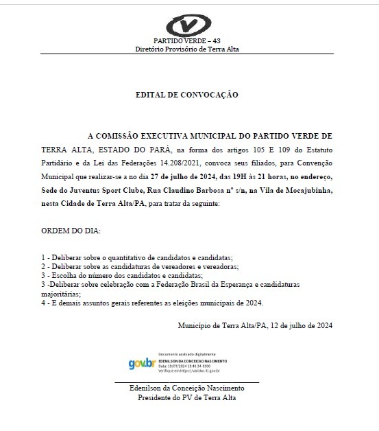 Publicado o edital de convocação para Convenção Eleitoral Conjunta Municipal do Partido Verde no Município de Terra Alta – Pa